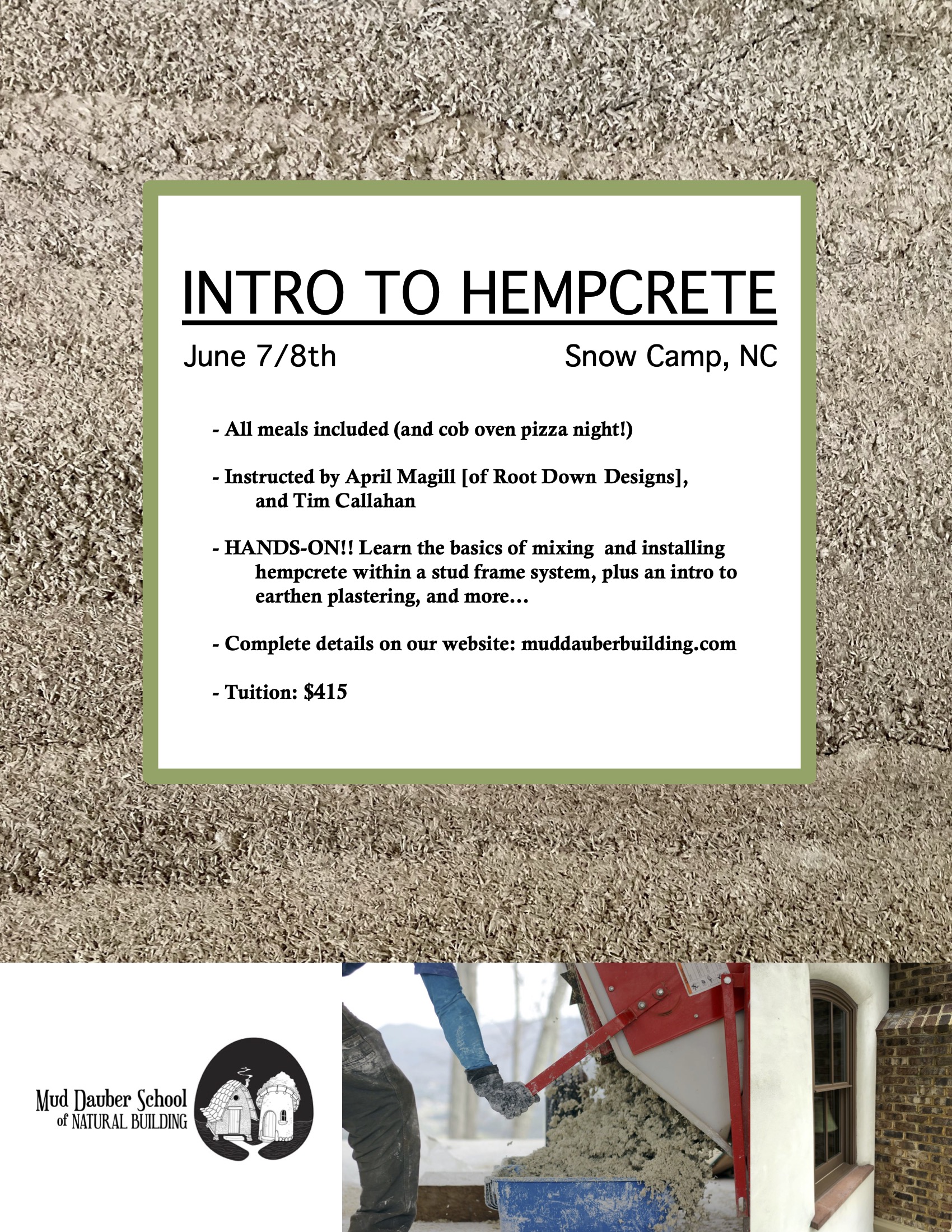 In addition to the hands-on worksite experience, April and Tim will be presenting more details about hempcrete in a slideshow/Q+A format. Also, Greg and Danielle will lead a tour of the Mud Dauber Campus, to show their demonstration cottages made of cob and straw wall systems.
