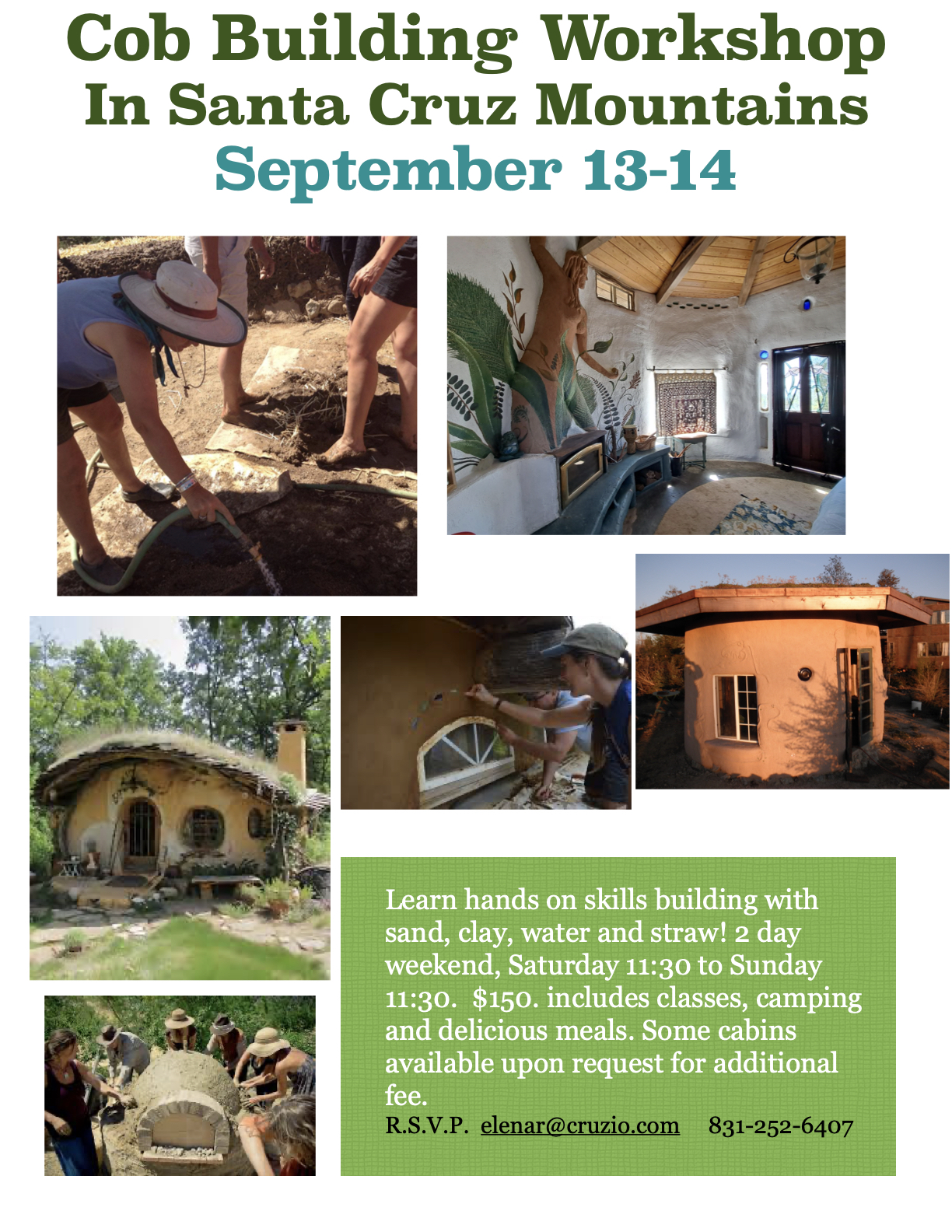 Cob/ Natural building workshop. Meet other like-minded folks in a peaceful retreat-like setting. Learn hands-on practical skills building a small dome like structure, Temazcal/Inipi. Inipi ceremony will be offered (a way to cleanse the body, mind, and spirit) camping,  along with delicious meals. Some cabins available upon request for additional fee.