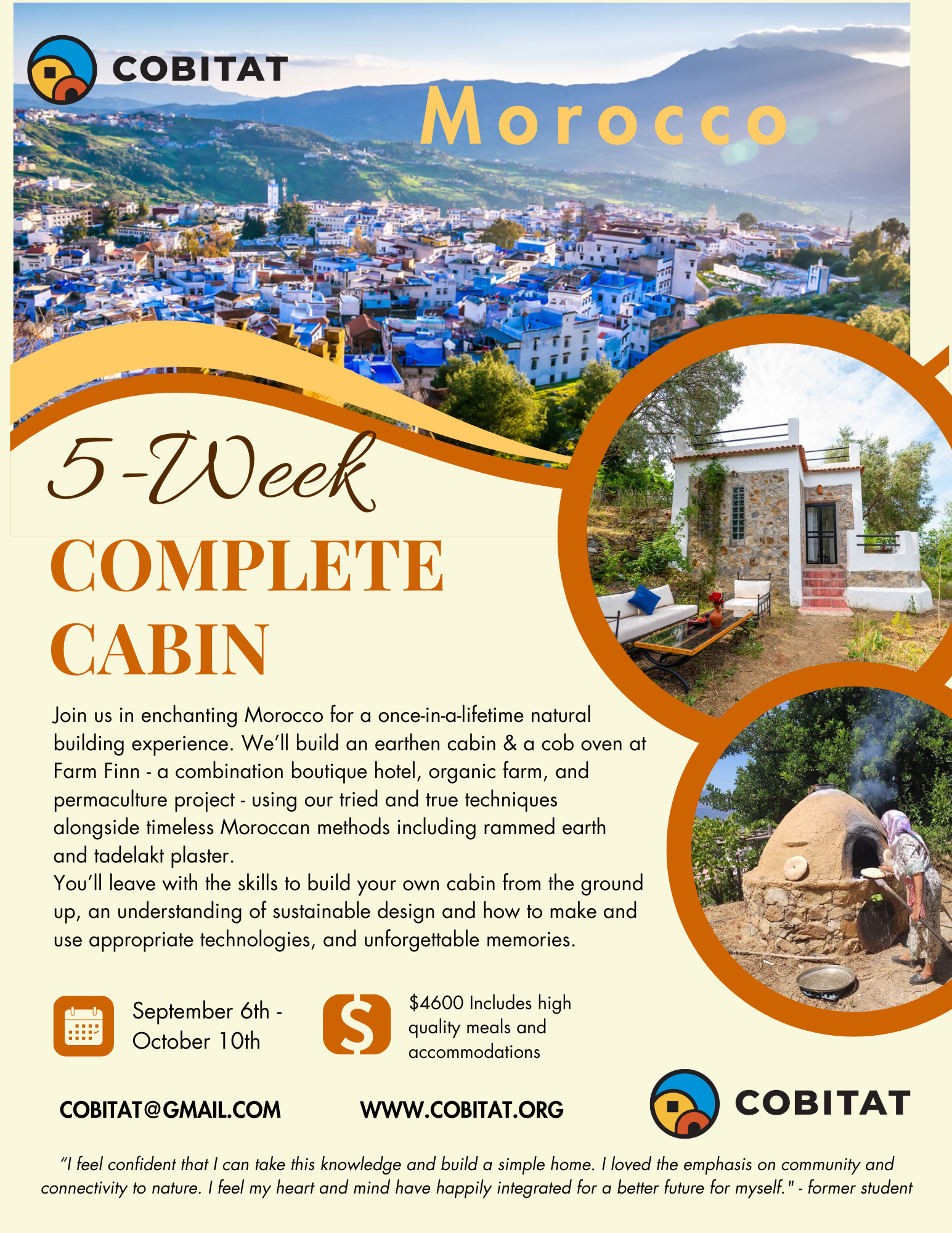 This is a special class for us at Cobitat. In addition to having a fascinating culture and history, diverse geography and ecosystems, and serving as the gateway between Europe and Africa, Morocco has a long history of earthen building. Earthen blocks, cob, and rammed earth walls along with lime plaster called tadelakt have all been used for centuries and into the modern era. But, like many vernacular building styles around the world, this knowledge is being lost as less sustainable and industrialized materials like concrete take over. Farm Finn, however, has worked with local knowledgeable craftsmen to build an earthen house and are excited to host us to help foster an exchange of learning around natural building. But, it doesn’t end there.